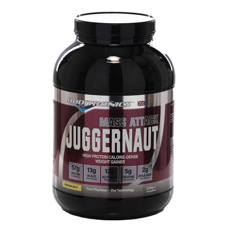 • Mix two heaped scoops (150g) in 350ml of water in a shaker or blender, shake vigorously for 20 seconds and consume. For best results, consume 2 servings per day. Safety Warning: Please note dietary supplements are not intended to diagnose, treat, cure or prevent any disease. It is always recommendable that you speak with a medical practitioner prior to taking any form of dietary supplementation, particularly if you have any current health concerns. Dietary supplements are intended to support an otherwise healthy lifestyle, and should not be a substitute for such. Please closely adhere to product guidelines and instructions for use. For any known allergens, please carefully consult the nutritional information provided and the list of ingredients. Box Contains: 1 x Mass Attack Juggernaut Powder, Banana Split.