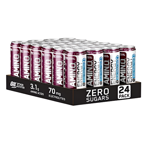 • Optimum Nutrition's ESSENTIAL AMIN.O. ENERGY + Electrolytes is specifically designed for those leading a fast-paced life. This top-selling sports nutrition drink is now available in a convenient 24-pack of 250 ml Mixed Berry cans, making it easier than ever to fuel your day. With no sugar and only 10 calories per serving, your body gets a refreshing and delicious energy boost without the guilt. Each can contains 3.1 g of essential amino acids sourced from nature, which supports muscle recovery and endurance. The added 100 mg of caffeine enhances your mental focus, making it an ideal companion for workouts or busy days. Enjoy invigorating flavors like Tropical, Orange, and Mixed Berry while rehydrating with 70 mg of electrolytes to replace what’s lost in sweat.