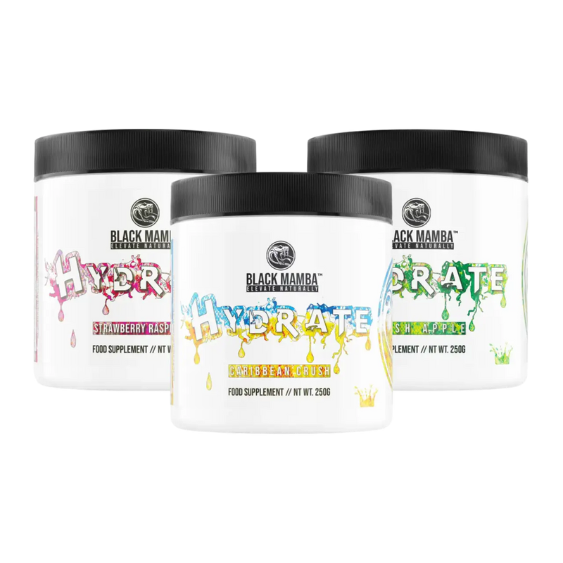 Available in three mouth-watering flavors, Caribbean Crush, Strawberry Raspberry, and Fresh Apple, Black Mamba Hydrate turns hydration into a tasty experience!