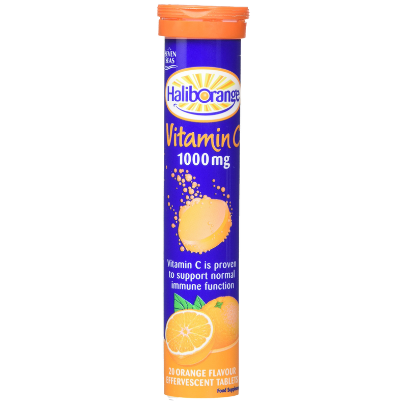 RDA = EC Recommended Daily Allowance. RECOMMENDED DAILY INTAKE: One tablet dissolved in a glass of water to be taken up to twice daily. Women who are pregnant or planning a pregnancy should consult their doctor before taking vitamin or mineral supplements. Check seal is intact before first use. REPLACE LID SECURELY. Safety Warning: KEEP OUT OF REACH OF CHILDREN. STORE IN A COOL, DRY PLACE. Additives: Free From Artificial Preservatives. Box Contains 1 x Seven Seas Haliborange Effervescent Vitamin 'C' Orange Flavour 20 Tablets.