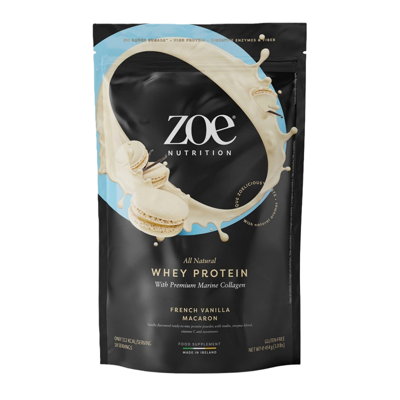 Discover the revolutionary ZOE Nutrition Whey Protein with Premium Marine Collagen, featuring the unique French Vanilla Macaron flavor! This product represents the cutting edge of nutritional science, combining hydrolyzed whey protein with the first-ever globally available marine collagen. Crafted with precision in Ireland, this well-rounded formula is designed to elevate your health regimen.